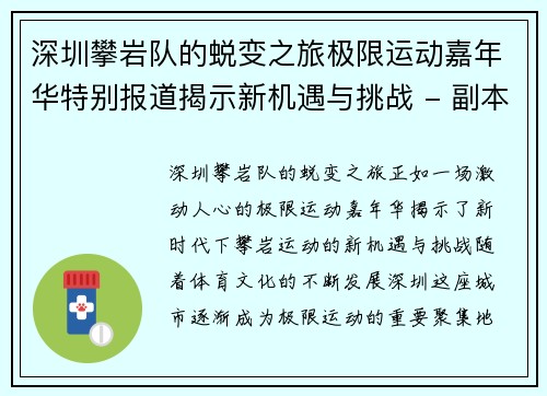 极限运动是一项充满挑战与刺激的活动,它不仅需要个人的勇气和技巧,也强调团队之间的默契与协作。上海极限运动队作为这方面的佼佼者,展现了极限运动所蕴含的独特魅力和深厚内涵。在这篇文章中,我们将从四个方面详细探讨极限运动的魅力、团队协作的重要性,以及上海极限运动队背后的精彩故事与秘密。通过这些内容,读者将...