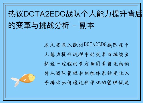 本文将深入探讨BLG战队在电子竞技领域中的运营策略与市场表现,通过对其成功之道进行全面分析,揭示其在战队管理、品牌建设、市场营销及团队文化等多个方面的独特做法。首先,我们将关注BLG战队如何通过科学的管理体系提升团队整体竞争力;其次,探讨其品牌建设策略如何增强粉丝忠诚度和影响力;接着,分析BLG在市...